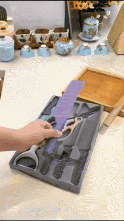 Incluye base acrílica, tabla, tijeras, pelador y tres cuchillos esenciales. Perfecto para hogares y cocinas que buscan eficiencia. Todo en un solo lugar y siempre listo para usar.